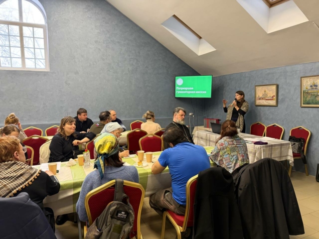 Координатор Патриаршей гуманитарной миссии Вероника Абалмасова садится рядом с ней на стул: